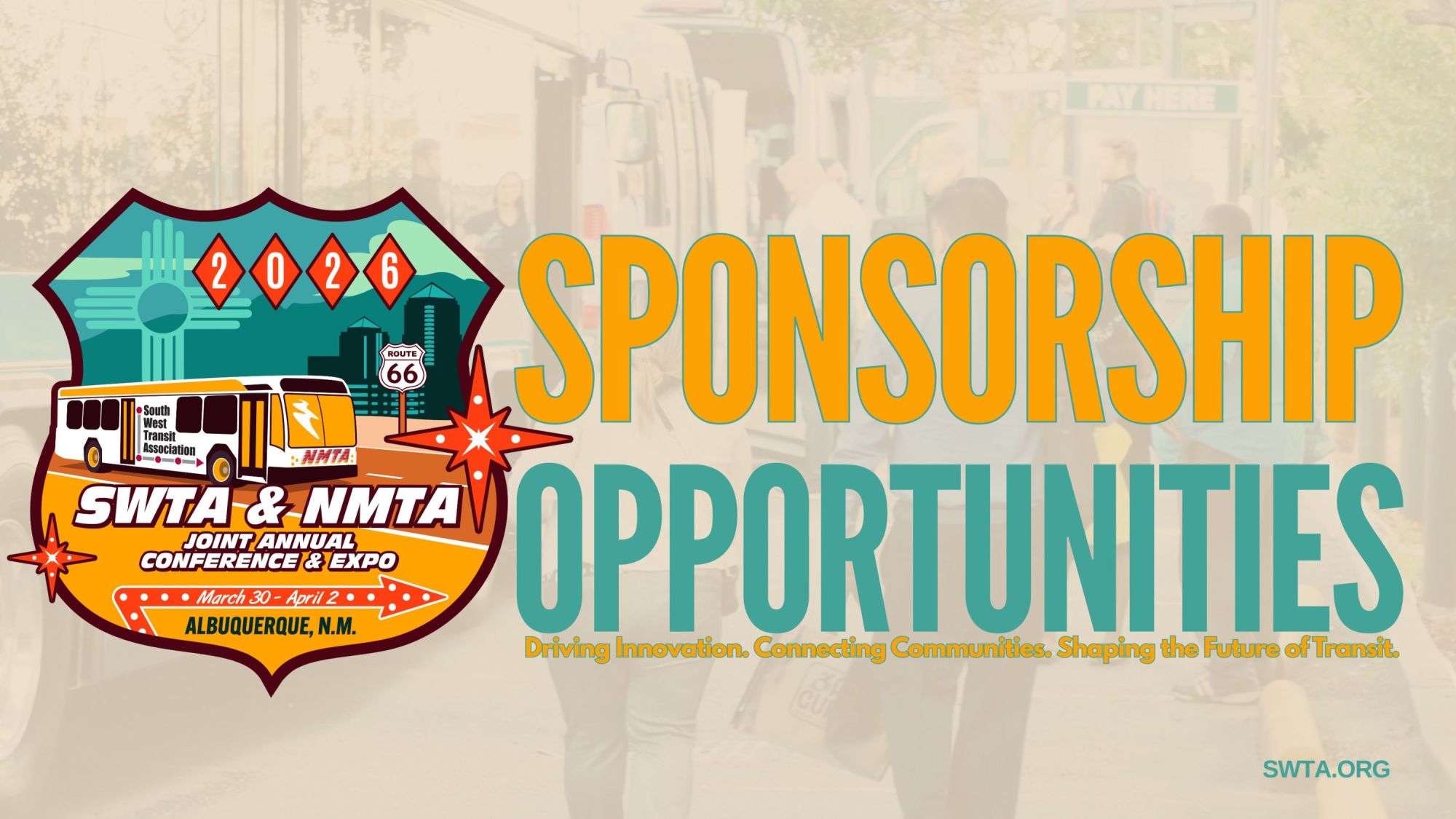 Get ready for the largest transit event in the Southwest — where innovation, collaboration, and opportunity meet! Sponsoring the 2026 SWTA & NMTA Joint Annual Conference & Expo, taking place March 30–April 2, 2026, in Albuquerque, New Mexico, puts your organization front and center with hundreds of transit leaders, decision-makers, and industry partners shaping the future of mobility.