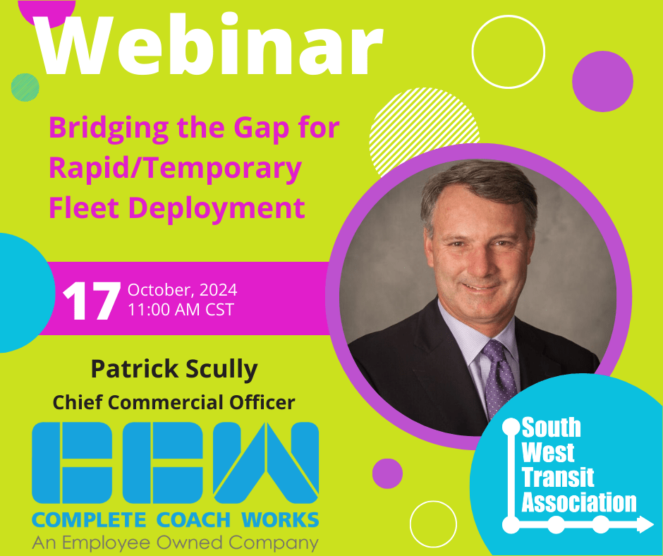 Join SWTA and Complete Coach Works for a webinar on how to Bridge the Gap when buses are needed. Topics of discussion include: