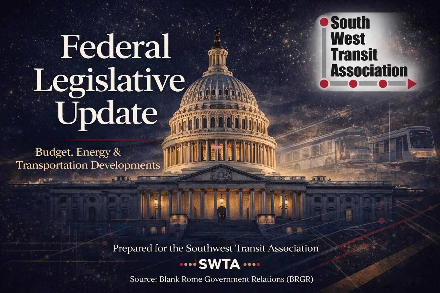 The Southwest Transit Association provides the following legislative update based on analysis and reporting from Blank Rome Government Relations (BRGR), supplemented by information from trusted news sources and federal agency releases.